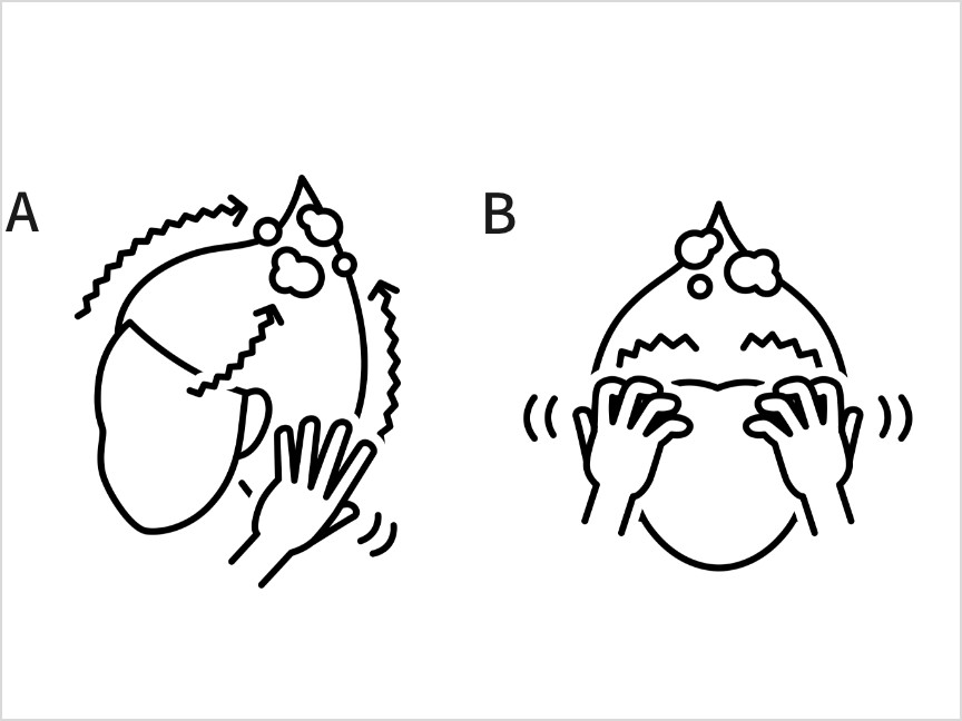 前頭部→側頭部→後頭部の順にジグザグに動かしながら頭頂部に向かってマッサージ。この時爪を立てるのは絶対NG。必ず指の腹でゆっくりとできるだけ細かく洗いましょう。B) 生え際マッサージ