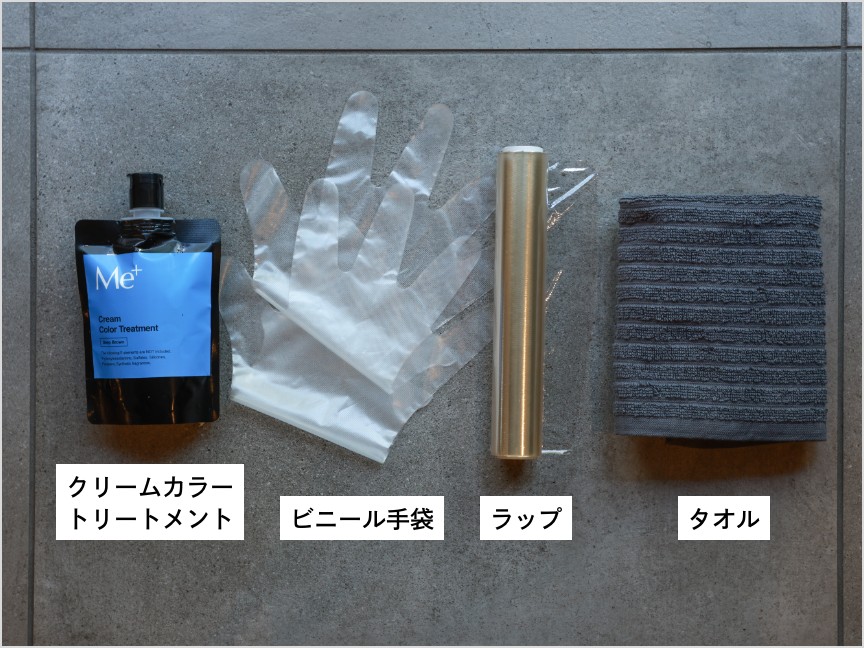 クリームカラートリートメント、ビニール手袋、ラップ、タオルを準備します。使用する際の洋服やタオルは色移りしてよい暗めの色を選び、さらに汚した時に備えウエットティッシュなどを準備しておくとよいでしょう。 -