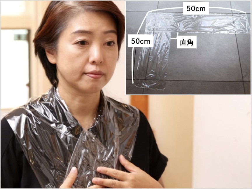 ラップを50㎝程度に2枚カットし、直角に重ねます。その直角の部分を首にあてV字の先端をもってストールをかけるように肩にかけ胸元で重ねて止めます。その後、ビニール手袋を装着したら、染めていきましょう。 -