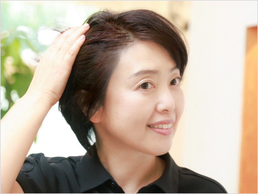 分け目の目立つ白髪をめがけて直接トリートメントを置いていくイメージでたっぷりと出し、白髪に指でなじませます。分け目を変えたり、髪をかきあげたときに白髪の染め忘れがないよう、いつもの分け目から左右1㎝程度に新しい分け目をつくり、それぞれトリートメントを同様に塗りましょう。 -