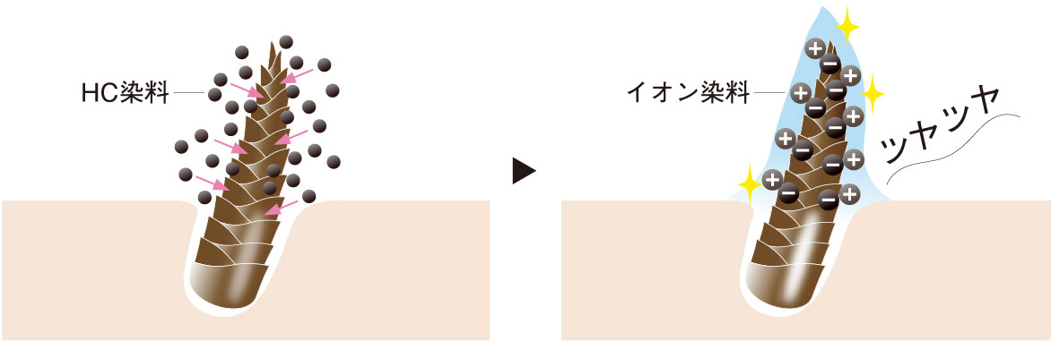 極小分子量の「HC染料」がキューティクルから髪内部に入り込み、内側からジワジワ染髪します。