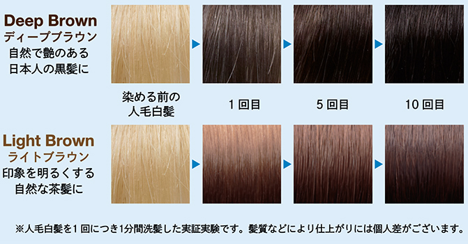 個人差はあるものの、10回程度連続使用いただくと体感できる設計です。万一染まりづらさを感じるなら、量やマッサージの時間を増やしたり、気になる白髪の部分に直接シャンプーの液体を付けもみ込み、時間をおくなどするとより染まりやすくなります。人の毛髪は約10万本と言われ、染まってほしい白髪に意外と触れていない可能性もあるんです。